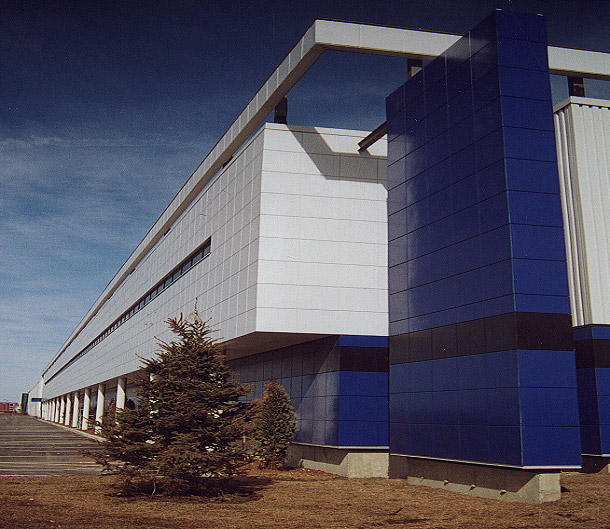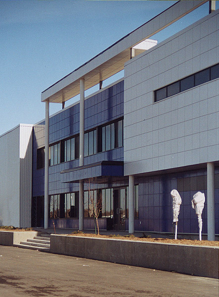 À partir du système du procédé industriel spécifique du client, la conception s’est établie sur une trame cartésienne rigoureuse. L’usine est construite par l’arrimage de volumes pleins ou évidés correspondant directement au programme des usagers. Les murs aveugles en presque totalité, sans artifices, offrent à chacune des ouvertures un aspect audacieux et privilégié. Construit aux abords de l’autoroute 13 à Laval, ce vaisseau semble bien ancré au paysage.